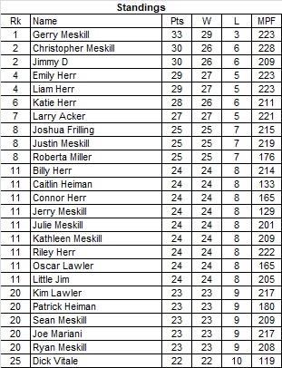 In the standings, we have a sole leader for the first time. Gerry Meskill got 29 of 32 correct in round 1 to put himself atop the leaderboard. He also got all 7/10 seeds and the midwest region correct for the bonuses. Next up, the round of 32 on Saturday.